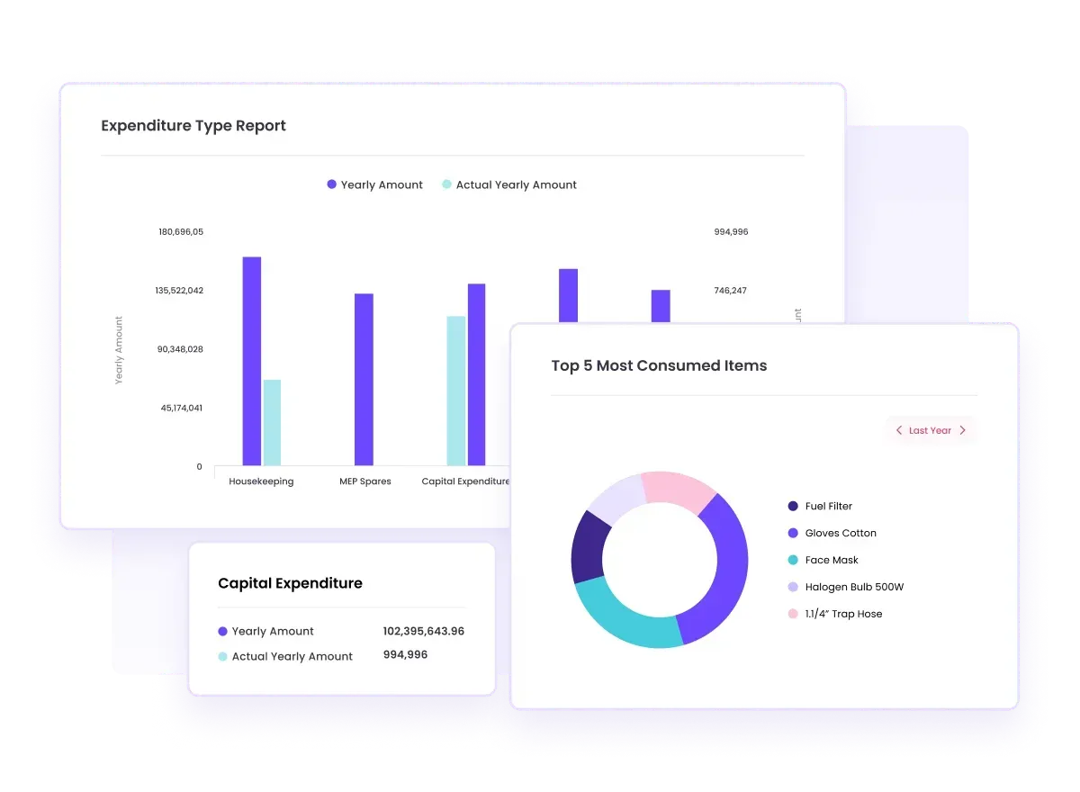 - Facilio provides strategic insights through comprehensive dashboards, which visualize patterns in parts usage and track inventory levels. This helps in making data-driven decisions to reduce overhead costs and improve operational efficiency.